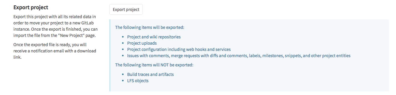 Existing projects running on any GitLab instance or GitLab.com can be exported with all their related data and be moved into a new GitLab instance.
